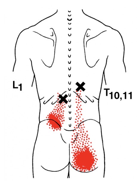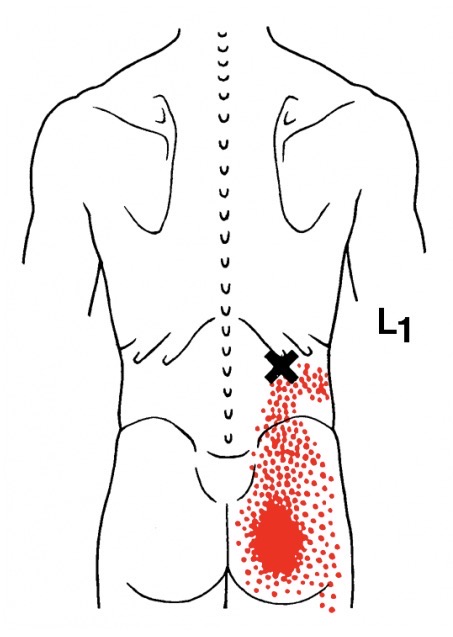 Pain spreads across the lower back and may extend into the upper buttock or lateral hip.